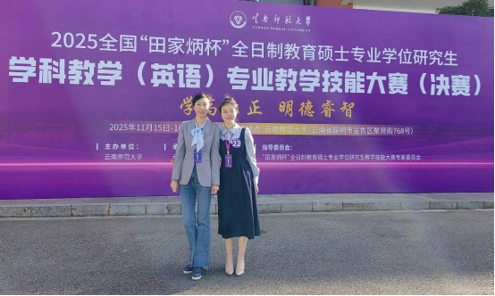 11月14日至16日,2025全国“田家炳杯”全日制教育硕士专业学位研究生学科教学(英语)专业教学技能大赛(决赛)在云南师范大学举行。我校外国语学院2023级学科教学(英语)专业教育硕士孙宛情荣获一等奖,指导教师王鹤获评“优秀指导教师”,实现我校参加该赛事以来的历史性突破。